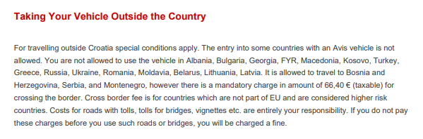 Ma käisin mõned rahvusvahelised rendifirmad läbi ja nemad tahtsid kõik lisaraha Horvaatiast välja sõites. AVIS näiteks vastas alljärgnevalt: