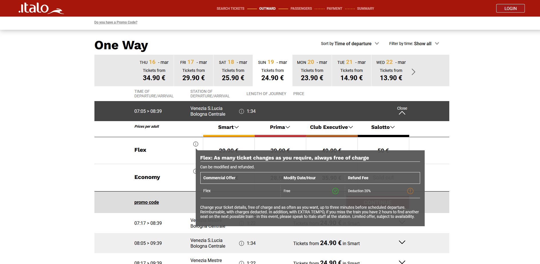 Suvel lähen Itaaliasse, liigun rongidega. Hakkasin uurima Italotreno lehte, aga ei saanud hästi aru nende rongipiletite tüüpidest. Millist soovitate võtta, nt Smart või Prima? Kas 14-aastasele on soodustus? Kas need piletid on konkreetsele ajale või minu hilinemise korral saan ka järgmise rongiga sõita? Kodulehel on konkreetne aeg kirjas. Millele veel pean tähelepanu pöörata? Üldse liigume Veneetsiast Bolognasse, edasi on Bologna- Firenze, Firenze- La Spezia ja edasi juba Milanosse.
