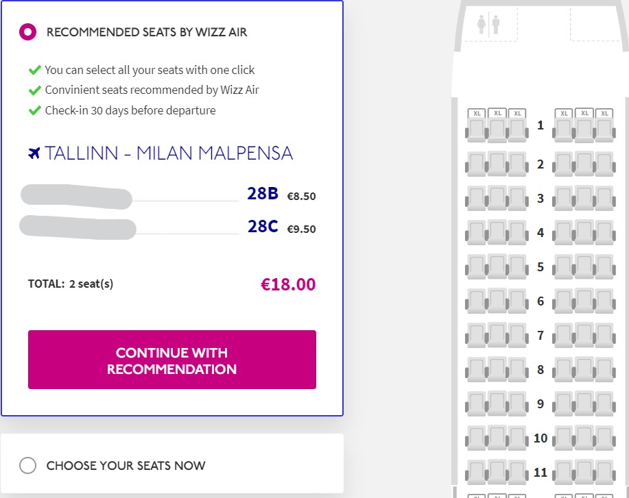 Ostetud kõige odavamad piletid, millele kehtib tingimus, et "You have the opportunity to choose your seats for a fee while booking. If you prefer not to book one, we will assign a random seat for you during the check-in, 48 hours before flight departure."