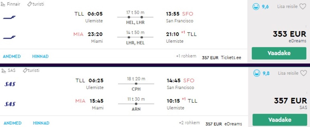 Alusta oma reisi San Franciscost ning lenda tagasi Eestisse päikeselisest Miamist. Soodsa hinnaga lennupileteid pakuvad nii Oneworldi lennufirmad (Finnair, American Airlines, British Airways) kui SAS. Selliste lennupiletite otsimiseks mine Momondo.ee ning vali "mitu-linna" otsing.