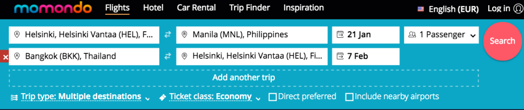 Open-jaw lennupiletite otsimiseks kasutada Momondo.com otsingumootoris Multiple destinations võimalust.