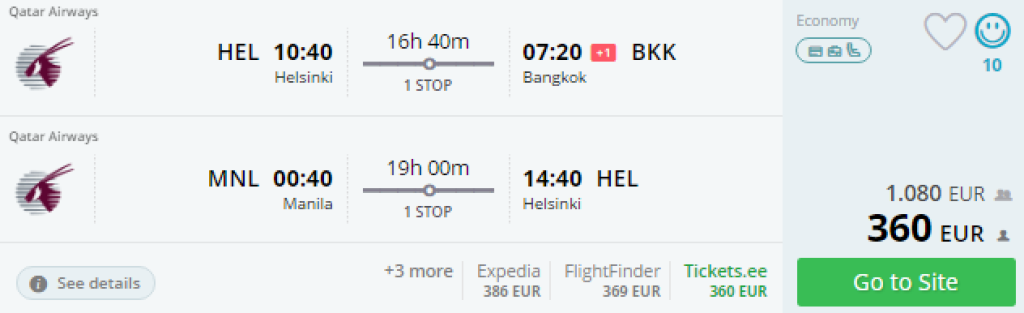 Helsingi - Bangkok//Manila - Helsingi 360€