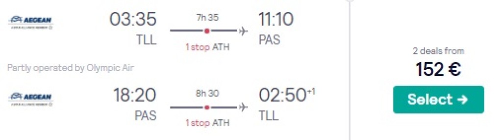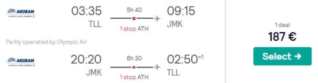 Aegean Airlines pakub hetkel hea hinnaga lennupileteid mais-juunis Kreetale, Lesbosele, Mykonosele või Parosele. Edasi-tagasi lennupiletid on saadaval alates 152€ eest. Lendudel on mõlemal suunal üks ümberistumine Ateenas. Soodsa hinnaga lennupiletid leiad üles allpool olevast kuupäevavalikust.