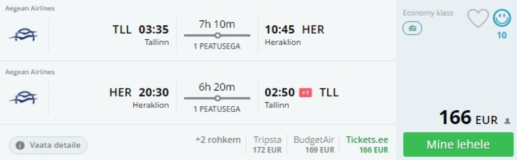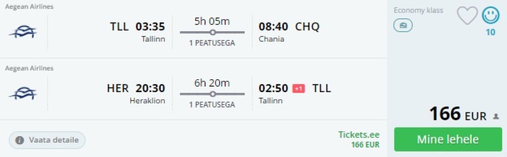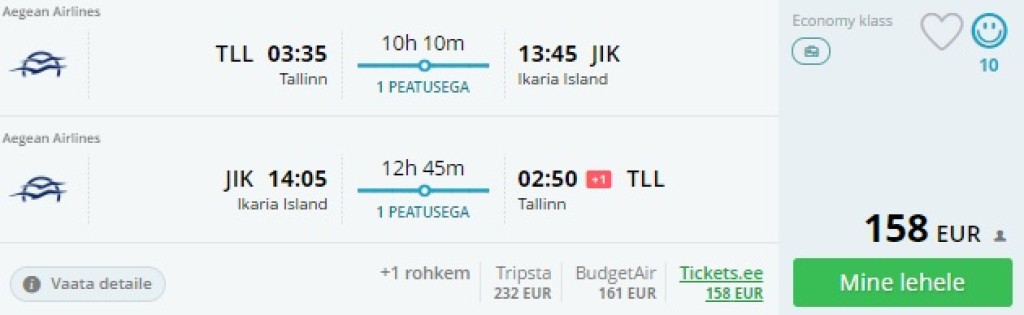 Aegean Airlines pakub hetkel väga soodsa hinnaga lennupileteid oktoobrikuuks Kreeka saartele. Edasi-tagasi lennupiletid Tallinnast Kreetale, Naxosele, Ikariale ja Milosele on saadaval al 148€ eest ning saadaval on viimased soodsad piletid oktoobri alguseks. Parima hinnaga lennupiletid leiad lihtsasti üles läbi momondo.ee.