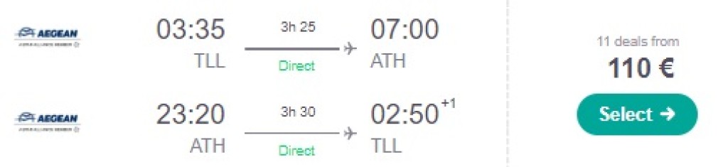 Aegean Airlines pakub hetkel väga hea hinnaga lennupileteid suveks otselendudele Tallinnast Ateenasse. Edasi-tagasi lennupiletid on saadaval alates 110€ eest alates mai lõpust kuni augustini. Piletiteni jõudmiseks kliki allolevatel otselinkidel või kontrolli endale sobivaid lennukuupäevi läbi Skyscanneri.