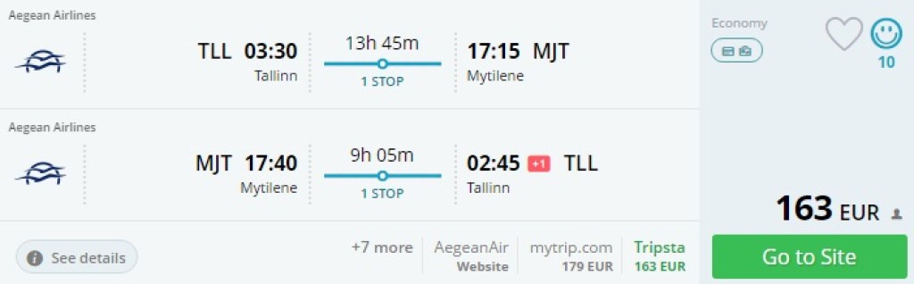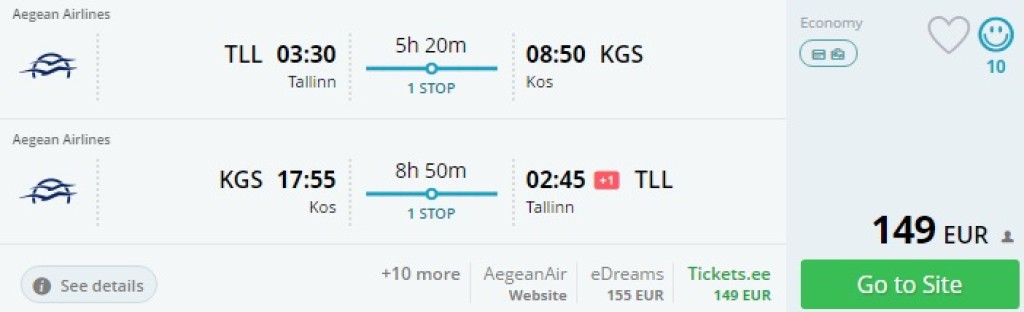 Hetkel on saada väga hea hinnaga lennupiletid suveks Tallinnast Kreeka saartele (Lesbos, Mykonos, Kos, Kreeta, Rhodos, Korfu). Lennufirmaks Aegean Airlines. Saadaval on üksikud lennukuupäevad juunikuus. Lennud ühe ümberistumisega mõlemal suunal Ateenas (võimalik valida kiired ümberistumised või veeta päev ühel suunal Ateenas). Soodsad (al 143€) lennupileteid leiad aadressil momondo või kasuta otselinke allpool.