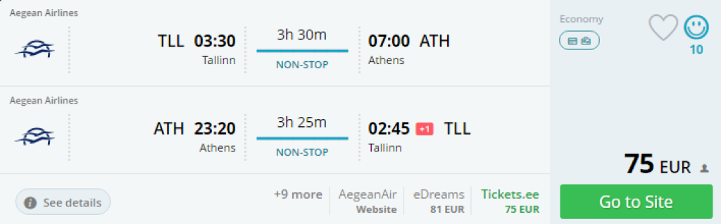 Aegeanil on väljas graafik suvistele lenupiletitele: edasi- tagasi lennupiletid Tallinnast Ateenasse on saadaval hinnaga al 75€. Saadavs mai lõpust augustini ning tegemist on otselendudega. Soodsaid lennupileteid otsi läbi Momondo.com