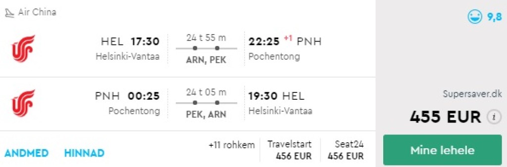 Air China pakub hetkel soodsat võimalust külastamaks Kambodžat. Edasi-tagasi lennupiletid Helsingist või Stockholmist Phnom Penhi algavad 419 eurost ning saadavust leiab alates oktoobrist kuni märtsi keskpaigani. Parima hinnaga lennupiletid leiad üles läbi Momondo.ee või klikkides allolevatel otselinkidel.