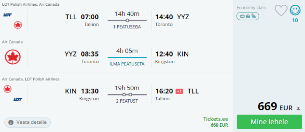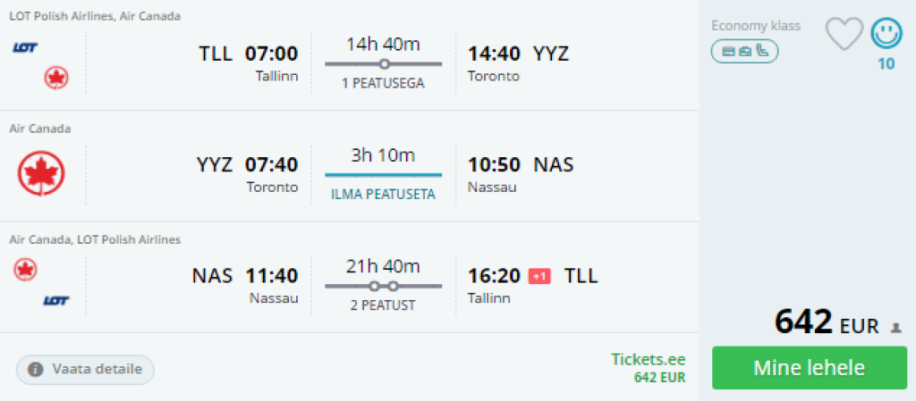 Hetkel on saadaval soodsad "multi-city" lennupiletid Air Candaga Tallinnast külastamaks ühel reisil Torontot ning Bahama saari, Jamaicat või Turksi ja Caicost. Lennupiletite hinnad algavad 626 eurost.Ostmiseks kliki meie poolt välja toodud näidiskuupäevadel või otsi ise läbi Momondo.ee.