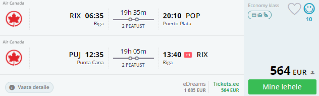 Air Canada pakub hetkel väga soodsaid "open-jaw" lennupileteid talveks Riiast Dominikaani Vabariiki. Mugavate ümberistumistega lennud Puerto Platasse, tagasilennuga Punta Canast on saadaval hinnaga al** 564€**