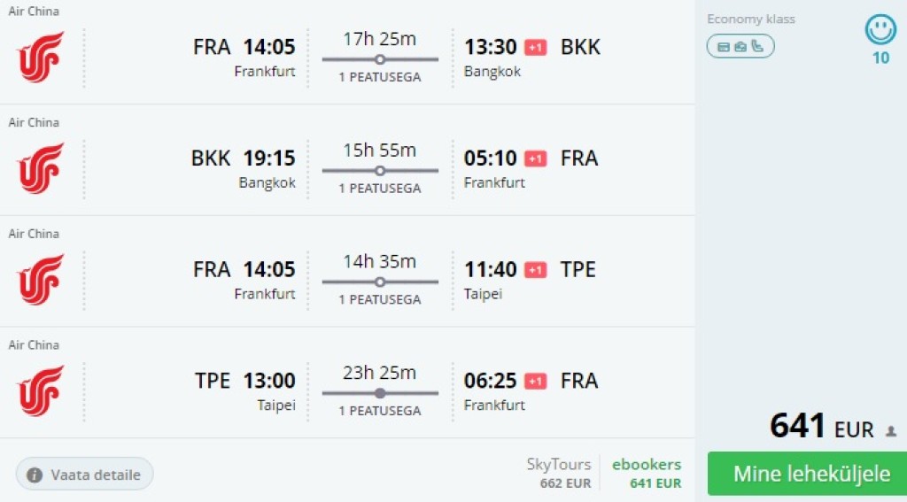 Air Chinal on praegu huvitav pakkumine: ostes samaaegselt kahe erineva reisi lennupiletid, saad piletid kätte peaaegu ühe reisi hinnaga. Reisi võib alustada Saksamaalt (Frankfurt, München, Düsseldorf) või Stockholmist, kust piletid on siiski 200-300 eurot kallimad. Sihtkohtade valik Aasias on väga suur, lisaks saab lennata ka Austraaliasse Sydneysse ja Uus-Meremaale Aucklandi. Lennuperiood on 1. jaanuarist 2017 kuni 15. juulini 2017. Kahe reisi vaheline aeg ei oma tähtsust, võib olla vabalt näiteks 3 – 4 kuud. Saadavus on väga hea. Katsetada võib igasuguseid kombinatsioone. Mõned Air China sihtkohtadest: Sydney, Auckland, Bangkok, Phuket, Taipei, Hongkong, Tokyo, Ho Chi Minh City, Manila, Jakarta, Singapur, Kuala Lumpur, Seoul, Jeju, Naha (Okinawa), Siem Reap.