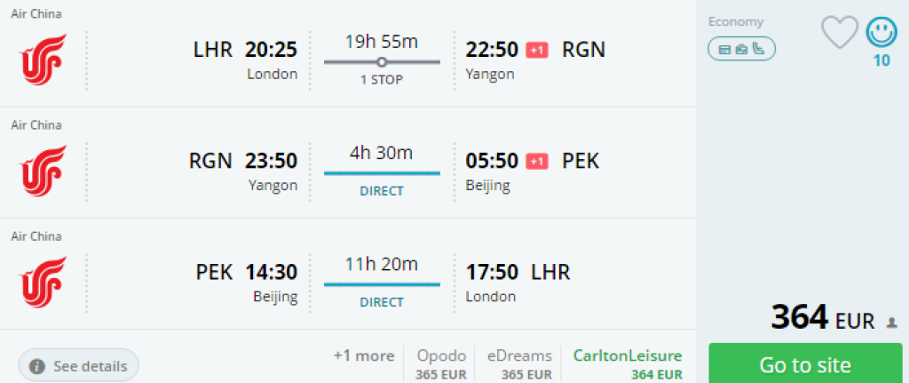 Hetkel on saadaval väga soodsad lennupiletid Air China'ga Londonist Myanmari! Edasi- tagasi lennupiletite hinnad algavad 325 eurost. Saadaval on kuupevade kombinatsioone väljalennuga jaanuaris ja tagasilennuga veebruaris. Piletiteni jõudmiseks leidmiseks kasuta otselinke allpool või otsi lennupiletid üles momondo.co.uk abil.
