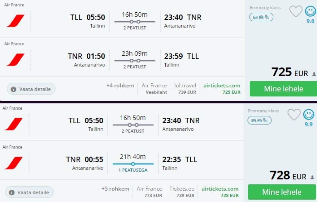 Air France pakub hetkel väga hea hinnaga lennupileteid Tallinnast Madagaskarile. Edasi-tagasi lennupiletid on saadaval alates 725€ eest ning lendudel on üks või kaks ümberistumist. Saadavust jagub jaanuarist kuni oktoobrini välja. Piletiteni jõudmiseks kliki näidiskuupäevadel allpool või kontrolli endale sobivaid lennukuupäevi läbi momondo.