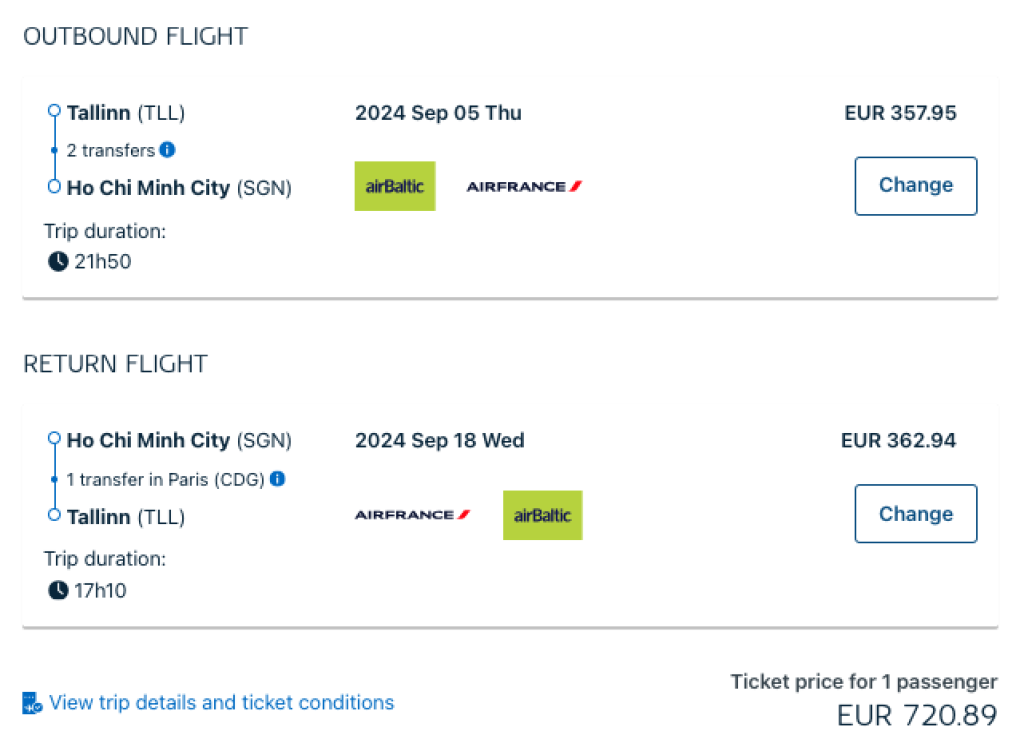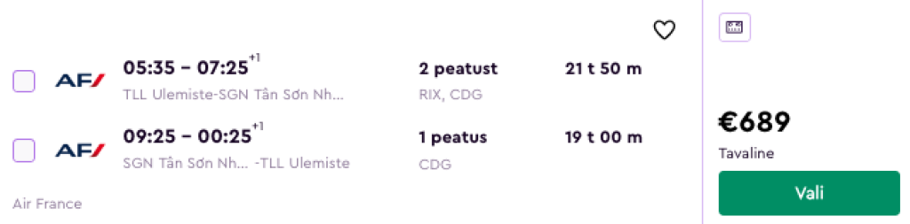 Skytraxi maailma parimate lennufirmade edetabeli 7. koht Air France pakub hetkel suurepärase hinnaga lennupileteid Vietnami. Koostöös airBalticuga on saadaval lennupiletid sügiseks Tallinnast Ho Chi Minh Citysse 689€ eest ning Tallinnast Hanoisse 684€ eest. Lennud on enamjaolt kiirete ümberistumistega ning lennupileitite hinnas sisaldub nii äraantav pagas kui toitlustamine Air France pardal.
