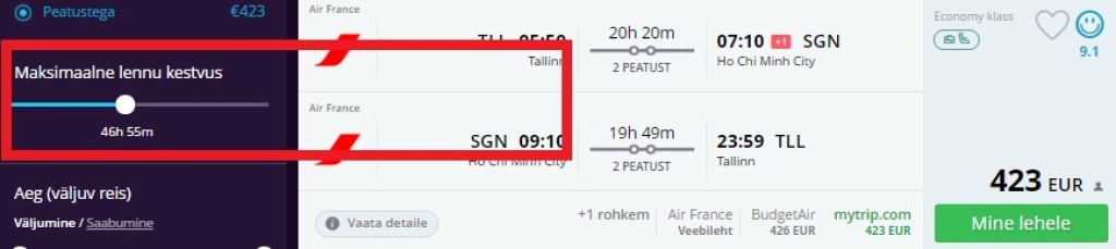 Kõikidel väljaotsitud lennukuupäevadel eksisteerib mugavate ümberistumistega lennud hinnavahemikus 423€-455€. Parimate ümberistumiste lihtsaks ülesleidmiseks optimeeri "maksimaalset lendude kestvust" alloleva ekraanitõmmise näitel: