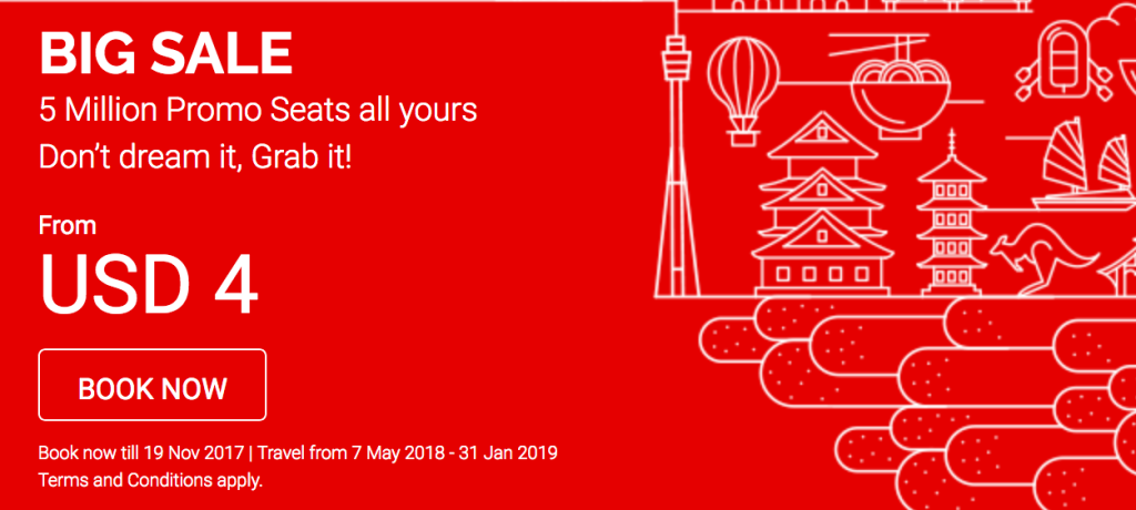 Tänasest algas Aasia suurimal odavlennufirmal AirAsia nende suurim kampaania BIG SALE! Reklaamide järgi on müüki paisatud lausa 5 miljonit soodsat lennupiletit. Kampaaniahinnaga lennupileteid saab soetada kuni 19.11.2017 ning iga lennu kohta on soodsate piletite arv piiratud. Kampaania kehtib lendudele vahemikus 07.05.2018-31.01.2019. Soodsa hinnaga lennupileteid leidub tegelikkuses ka kevadeks.