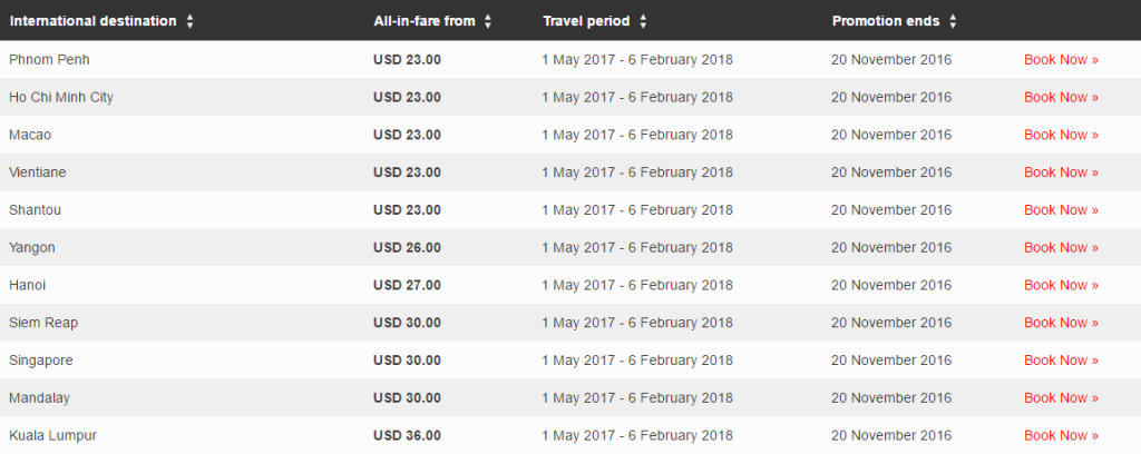 Aasia suurimal ning korduvalt maailma parimaks odavlennufirmaks valitud AirAsial on käimas müügikampaania lendudele perioodil 01.05.2017 – 06.02.2018. Lennupiletite hinnad siseliinidel algavad 3$ ning rahvusvahelistel lendudel alates 10$. Kampaania kestab kuni 20. novembrini.