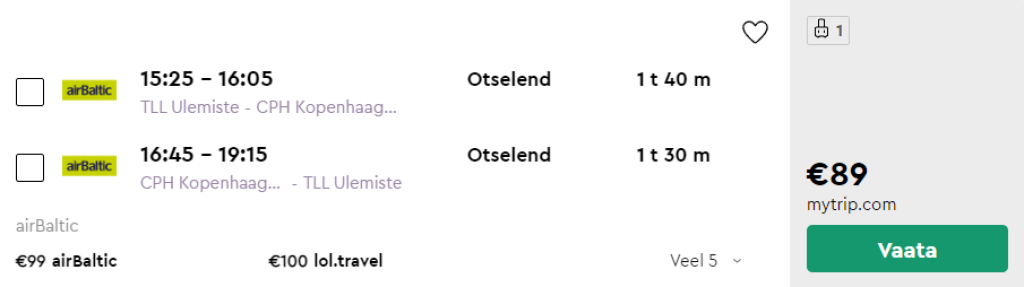 Toome välja soodsad näidiskuupäevad, kus kõik lennupiletite hinnad on kuni 105€. Saadavus on väga hea ka teistel kuupäevadel. Parima hinnaga lennupiletid leiad läbi Momondo.ee või meie soovitus on osta lennupiletid otse lennufirma airBaltic.com kodulehelt.