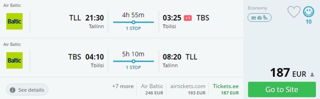 AirBalticul on müügis hea hinnaga piletid Tallinnast Gruusia pealinna Tbilisisse. Lennud toimuvad 3 korda nädalas kolmapäeviti, reedeti ja pühapäeviti, tagasilennud on vastavalt päev hiljem. Kolmapäeval ja reedel on Riias väga kiired ümberistumised, pühapäeviti on minnes ümberistumine veidi pikem. Pileteid on saada lendudele alates septembri algusest detsembri lõpuni. Hinnas sisaldub ainult käsipagas kaaluga kuni 8 kg.