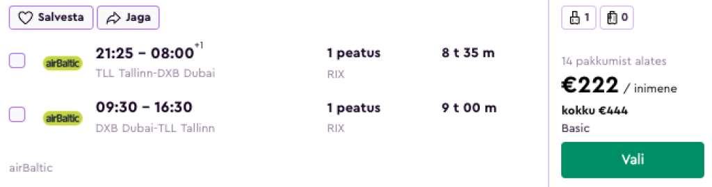 Toome allpool välja lennud + hotell näite, kuidas ise broneerides saab nädalase puhkuse (7ööd) Dubais kätte vaid 441€/in. Hinnas nii airBalticu lennupiletid kui tuba kahele koos hommikusöökidega Hiltoni hotelliketti kuuluvas hotellis koos hommikusöökidega.