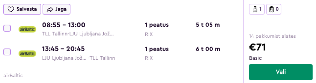 airBaltic pakub hetkel väga hea hinnaga lennupileteid Tallinnast Sloveeniasse. Edasi-tagasi lennupiletid Tallinnast Ljubljanasse on saadaval alates 71€ eest ning lendudel on mõlemal suunal üks kiire ümberistumine Riias.