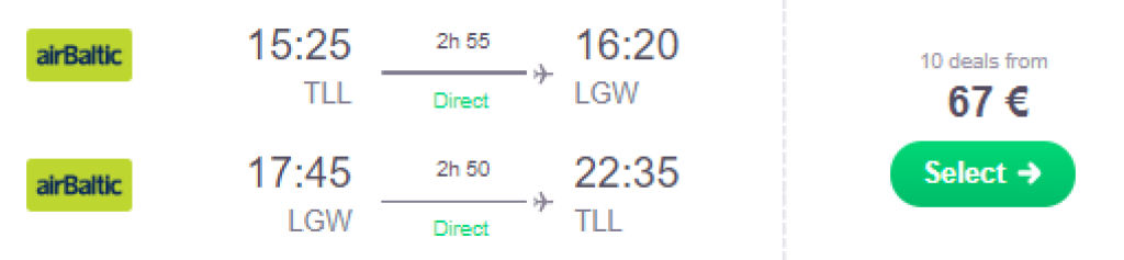 Hetkel on saadaval väga hea hinnaga otselennud airBalticuga suveks Londonisse! Edasi-tagasi lennupiletid Tallinnast on saadaval alates 67€ eest ning valikus on ohtralt soodsaid lennupileteid 2020. aastaks. Erinevalt teistest vedajatest on airBalticu lendude kellaajad sellised, mis ei eelda öist seiklemist lennuki peale jõudmiseks. Piletiteni jõudmiseks kliki allolevatel näidiskuupäevadel või kontrolli endale sobivaid kuupäevi läbi [skyscanneri](https://www.skyscanner.net/transport/flights/tll/lgw/200123/200128/?adults=1&children=0&adultsv2=1&childrenv2=&infants=0&cabinclass=economy&rtn=1&preferdirects=false&outboundaltsenabled=false&inboundaltsenabled=false&sortby=best&associateid=API_B2B_19043_00001&utm_medium=gsp&utm_source=Trip.ee&utm_campaign=Trip.ee%20-%20referrals&utm_content=referralTextlink).HotellipakkumisedParima hinnaga hotellipakkumisedleiad üles läbi hotellihindade võrdlusportaali Hotelscombined.ee.