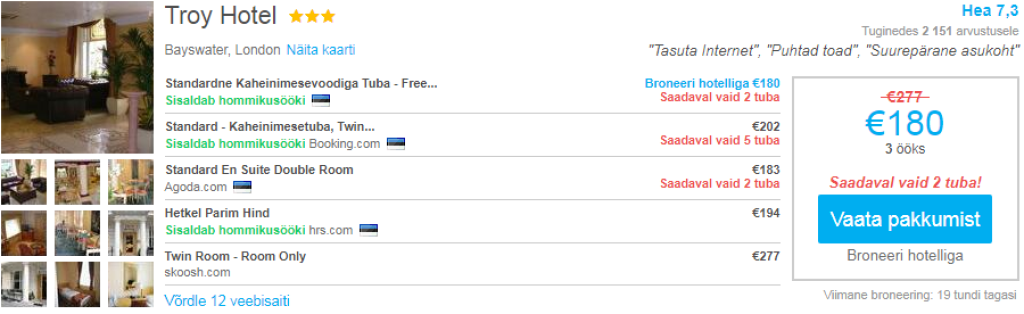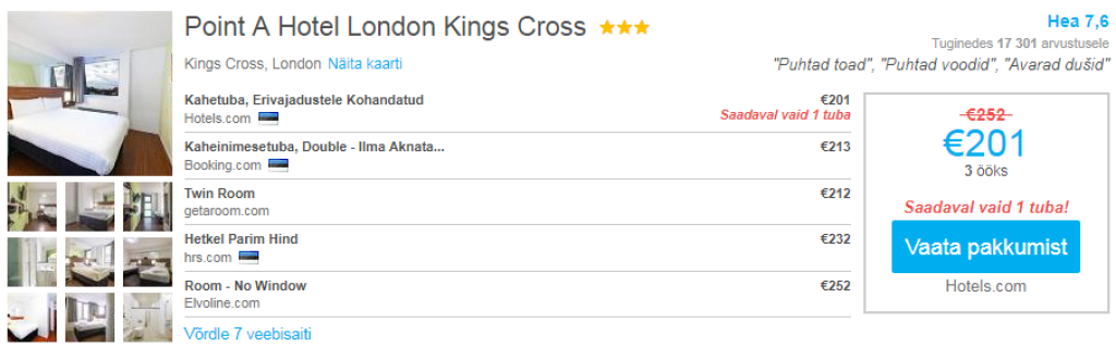 Otsisime välja hotellipakkumised veetmaks Londonis pikk nädalavahetus ehk siis kolm ööd. Meie poolt valitud kuupäevad on näidiskuupäevad, aga sama hinnaga või isegi soodsamalt leiab neidsamu hotelle ka sulle sobivatel kuupäevadel.