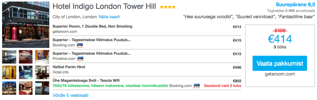 Otsisime välja hotellipakkumised veetmaks Londonis pikk nädalavahetus ehk siis kolm ööd. Meie poolt valitud kuupäevad on näidiskuupäevad, aga sama hinnaga või isegi soodsamalt leiab neidsamu hotelle ka sulle sobivatel kuupäevadel.