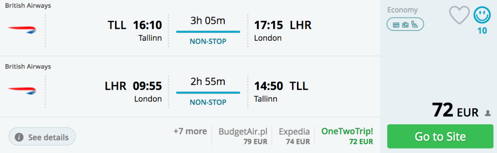 Soodsaid lennupileteid leidub hetkel peaaegu et kõikidele British Airwaysi lendudele Tallinnast Londonisse ja tagasi. Lennud toimuvad esmaspäeviti ning reedeti. Otsi endale sobivad lennukuupäevad läbi Momondo või kasuta otsimiseks näidiskuupäevade linke.