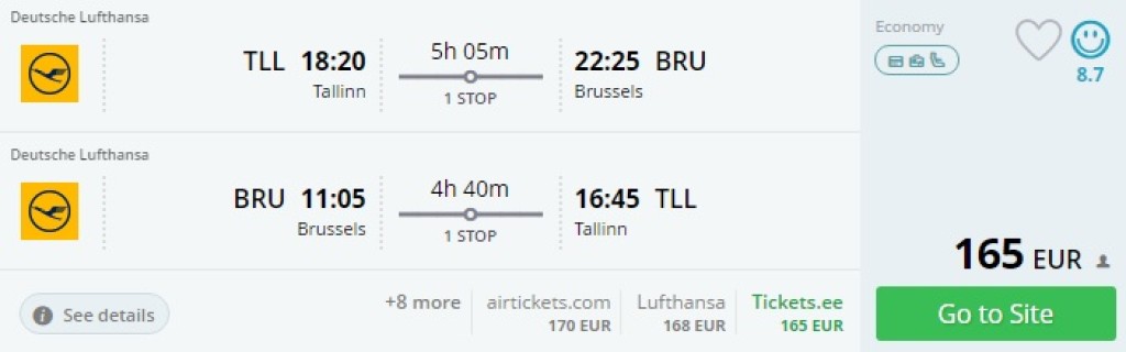Tulenevalt lennuaegadest on minnes vajalik ööbimine Brüsselis. Mugavaim variant Brüsselisse lendamiseks on Lufthansa, mis pakub kiirete ümberistumistega lende 165-175 euroga. Saadaval on ka teisi lennufirmasid (AirBaltic, Finnair).