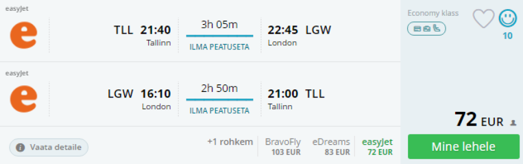 Hetkel on leitavad väga soodsad otselennud easyjetiga mais- juunis Tallinnast London Gatwicki. Edasi- tagasi lennupiletid saadaval hinnaga al 72€. Soodsad lennupiletid leiad läbi momondo või kasuta otselinke allpool.