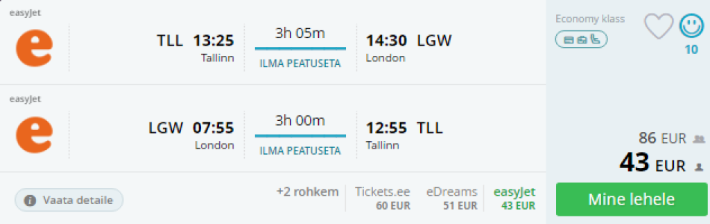 Hetkel on leitavad väga soodsad otselennud easyjetiga Tallinnast London Gatwicki. Edasi- tagasi lennupiletid saadaval hinnaga al 43€ . Rohke valiku soodsaid lennukuupäevi leiad novembrist kuni märtsini (v.a detsember). Soodsad lennupiletid leiad läbi momondo või kasuta otselinke allpool.