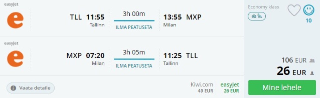Easyjet pakub hetkel väga hea hinnaga otselende Tallinnast Milanosse! Edasi-tagasi lennupiletid on saadaval hinnavahemikus 26€-51€ (sõltuvalt reisijate arvust). Piletid on nädalasteks reisideks mais-juunis. Lennupiletid leiad üles allpool asuvate otselinkide kaudu või läbi momondo.ee