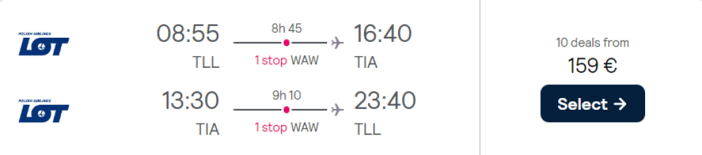 LOT pakub hetkel väga hea hinnaga lennupileteid Albaaniasse. Edasi-tagasi lennupiletid Tallinnast Tiranasse on saadaval alates 159€ eest. Soodsa hinna ja ühe kiire ümberistumisega lennupileteid leidub sügiseks. Toome allpool välja näidiskuupäevad, parima hinnaga lennupiletid leiab läbi Skyscanneri. Kui soovid piletid osta otse lennufirmalt, siis mine LOT.com ja sisesta soovitud kuupäevad otsingusse.