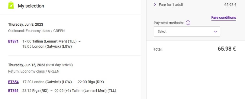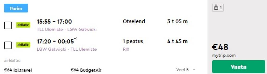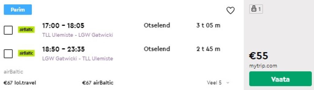 Mine airBaltic.com ja otsi üles endale sobivad lennukuupäevad marsruudil Tallinn (TLL) - London (LGW), hinnad alates 66€.