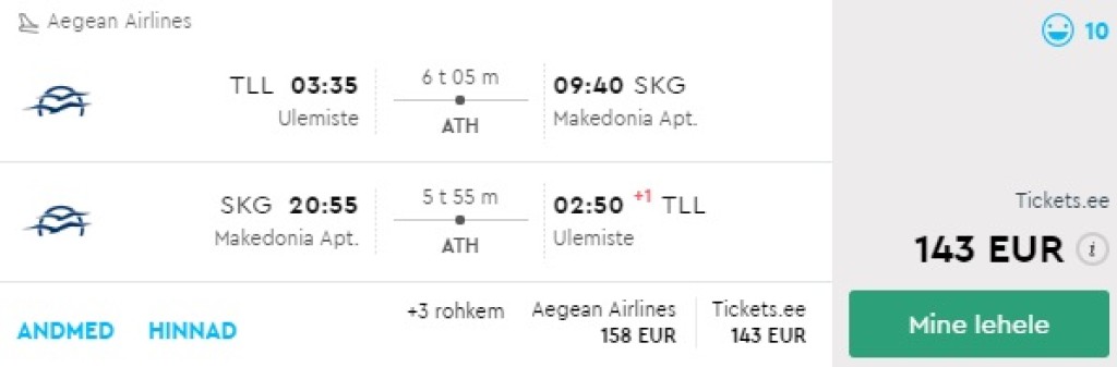 Aegean pakub hetkel väga hea hinnaga lennupileteid suveks Tallinnast Thessalonikisse. Edasi-tagasi lennupiletid on saadaval alates 143€ eest ning saadavus on augustis. Lennupiletite ostmiseks kliki allpool olevatel näidiskuupäevadel või otsi need ise läbi momondo.ee