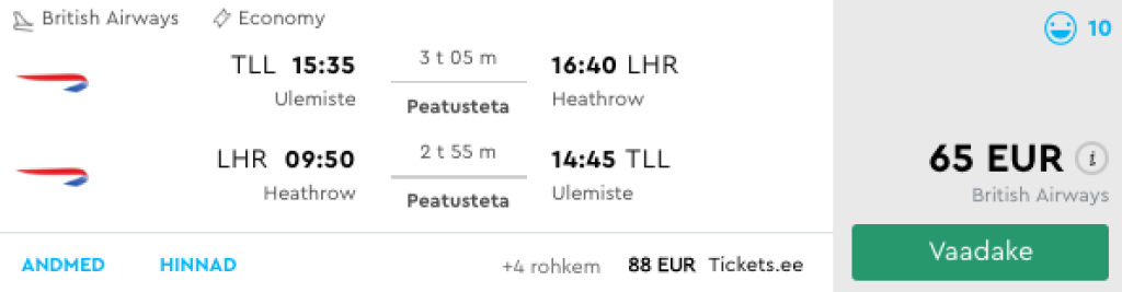 British Airways pakub hetkel väga hea hinnaga edasi-tagasi lennupileteid otselendudele Tallinnast Londonisse (Heathrow lennujaama) Soodsaimad edasi-tagasi lennupiletid on saadaval alates 65€ eest. Otsisime välja palju võimalikult soodsaid lennupileteid veetmaks Londonis pikk nädalavahetus. Lennud Tallinna ja Londoni vahel toimuvad kuni novembrini teisipäeviti ja reedeti ning alates novembrist esmaspäeviti ja reedeti, mis annab väga hea võimaluse veetmaks Londonis just nädalavahetus. Toome välja näidiskuupäevad ainult nädalavahetuste veetmiseks, soodsa hinnaga lennupiletid on ka saadaval külastamaks Londonit nädala sees või pikemalt kui 3-4 päeva. Otsi endale sobivad lennupiletid üles läbi Momondo.ee või kasutades otselinke allpool.