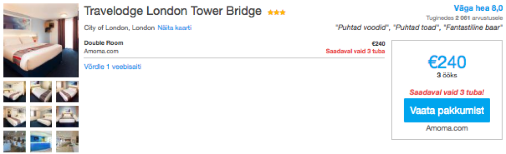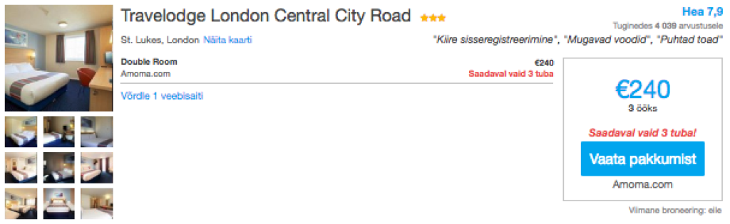 Teine soovitus on samuti Londoni kesklinna hotell Travelodge London Tower Bridge kus tuba kahele kolmeks ööks maksab 240€ . Lisainfo ja broneerimine