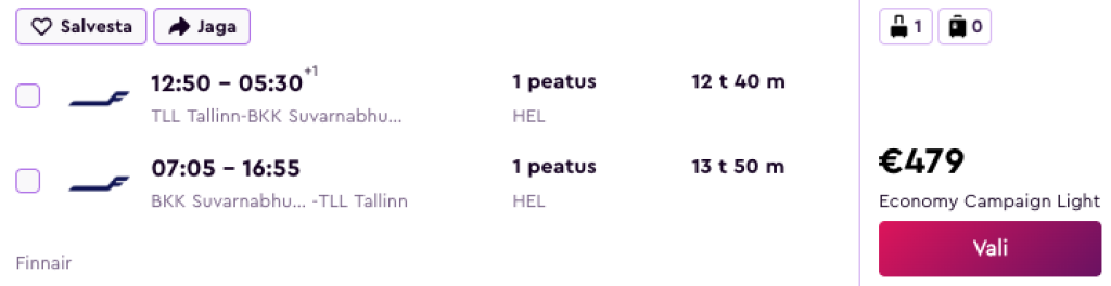 Viimane võimalus! Finnair pakub hetkel erakordselt soodsa hinnaga lennupileteid Tai Kuningriiki. Soodsaimad ühe kiire ümberistumisega edasi-tagasi lennupiletid Tallinnast Bangkokki on saadaval alates 479€ eest.