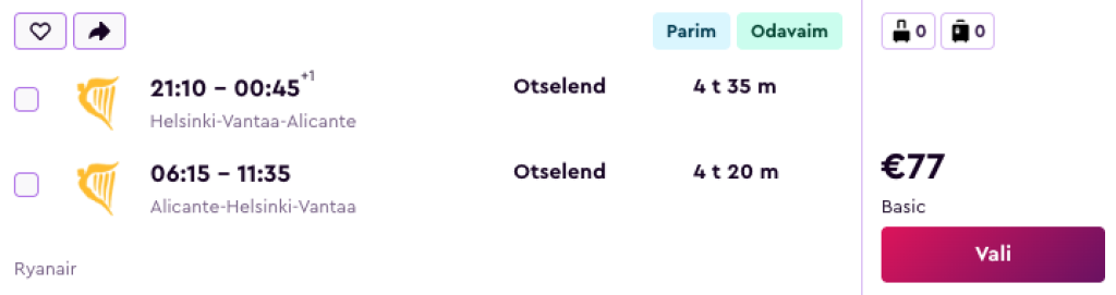Odavlennufirma Ryanair pakub hetkel suurepärase hinnaga lennupileteid Lõuna-Hispaaniasse. Edasi-tagasi lennupiletid otselendudele Helsingist Alicantesse on saadaval alates 77€ eest.
