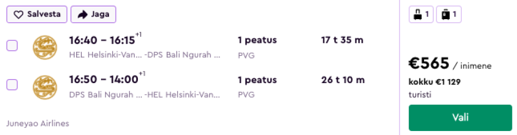 Toome allpool välja ka näite, kuidas saab ise broneerides kahenädalase puhkuse Balil kätte vaid 732€ eest (reisides kahekesi). Hinnas sisalduvad Juneyao lennupiletid (pagas hinnas) algusega Helsingist ning merevaatega tuba rannaäärses 4* hotellis (13 ööd).