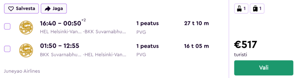 Juneyao Airlines pakub hetkel suurepärase hinnaga lennupileteid Taisse. Ühe ümberistumisega lennupiletid Helsingist Bangkokki on saadaval alates 517€ eest ning lendudel on üks ümberistumine Shanghais.