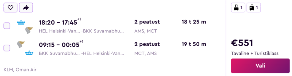 Oman Air koostöös KLMi ja Lufthansaga pakuvad hetkel suurepärase hinnaga lennupileteid Taisse. Kiirete ümberistumisega lennupiletid Helsingist Bangkokki on saadaval alates 551€ eest ning lennupiletite hinnas sisaldub ka äraantav pagas.