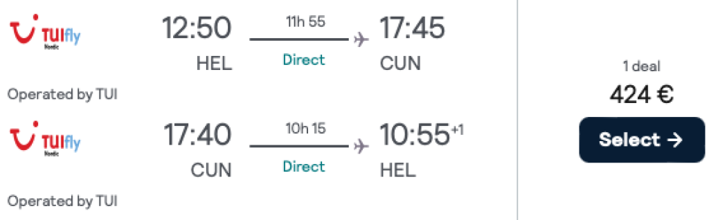 Soome reisikorraldaja TUI pakub hetkel suurepärase hinnaga viimase hetke lennupileteid Mehhikosse. Edasi-tagasi lennupiletid otselendudele Helsingist Cancuni on saadaval alates 424€ eest. Lennud Helsingist väljuvad päevasel ajal, seega jõuabl lennule ilusti mõnda laevaoperaatorit kasutades.