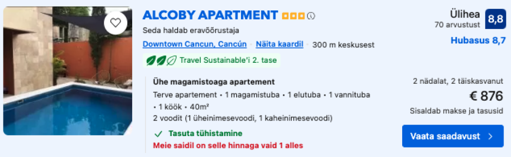 Toome allpool välja ka näite, kuidas saab ise oma reisi korraldades ja broneerides kahenädalase puhkuse (14ööd) Mehhikos kätte vaid 862€ eest (per person). Hinnas sisalduvad nii TUI otselennud Helsingist kui basseinivaatega tuba kahele Cancuni kesklinnas.