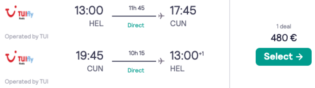 Soome reisikorraldaja TUI pakub hetkel väga hea hinnaga lennupileteid otselendudele Helsingist Mehhikosse. Edasi-tagasi lennupiletid Helsingist Cancuni on saadaval alates 480€ eest ning soodsa hinnaga lennupileteid leiab kahenädalaseks puhkuseks vahemikus 07.01-21.01. Lennud Helsingist toimuvad pealelõunasel ajal ning tagasilend Helsingisse jõuab ka sellisel ajal, et Tallinnast Helsingisse ja Helsingist Tallinnasse jõuab minna ka mõnda laevaoperaatorit kasutades.