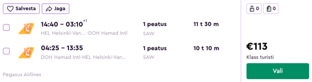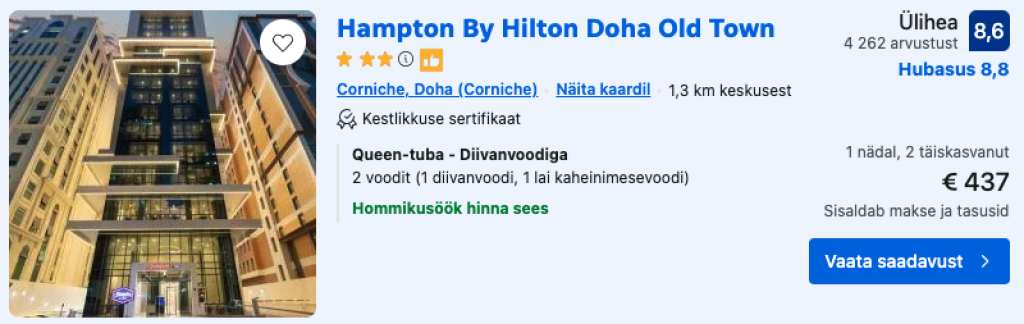 Toome ka välja näite, kuidas saab ise broneerides nädalase puhkuse Dohas kätte vaid 337€ eest (inimese kohta). Hinnas sisalduvad Pegasuse lennupiletid Helsingist Dohasse ning tuba Dohas asuvas 3* hotellis Hampton By Hilton Doha Old Town (hommikusöögid hinnas).