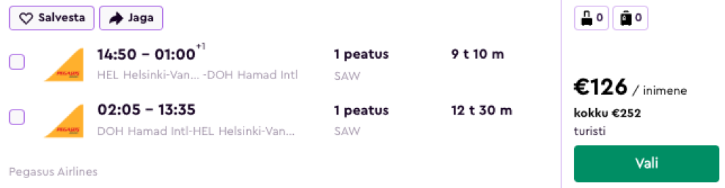 Toome ka välja näite, kuidas saab ise broneerides nädalase puhkuse Dohas kätte vaid 348€ eest (inimese kohta). Hinnas sisalduvad Pegasuse lennupiletid Helsingist Dohasse ning tuba Dohas asuvas 3* hotellis Hampton By Hilton Doha Old Town (hommikusöögid hinnas).