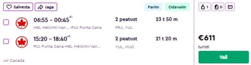 Air Canada koostöös Lufthansaga pakuvad hetkel väga hea hinnaga lennupileteid Dominikaani Vabariiki. Kiirete ümberistumistega lennupiletid Helsingist Punta Canasse on saadaval alates 611€ eest.