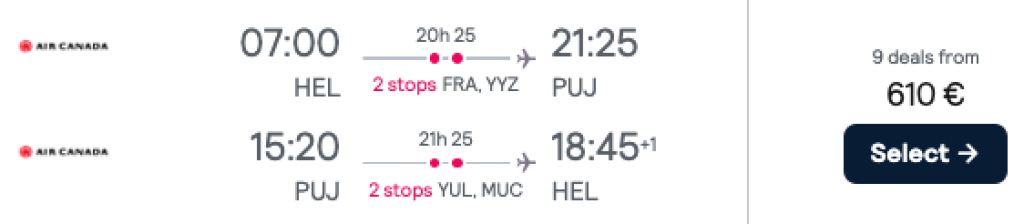 Air Canada koostöös Lufthansaga pakuvad hetkel väga hea hinnaga lennupileteid Dominikaani Vabariiki. Kiirete ümberistumistega lennupiletid Helsingist Punta Canasse on saadaval alates 610€ eest.